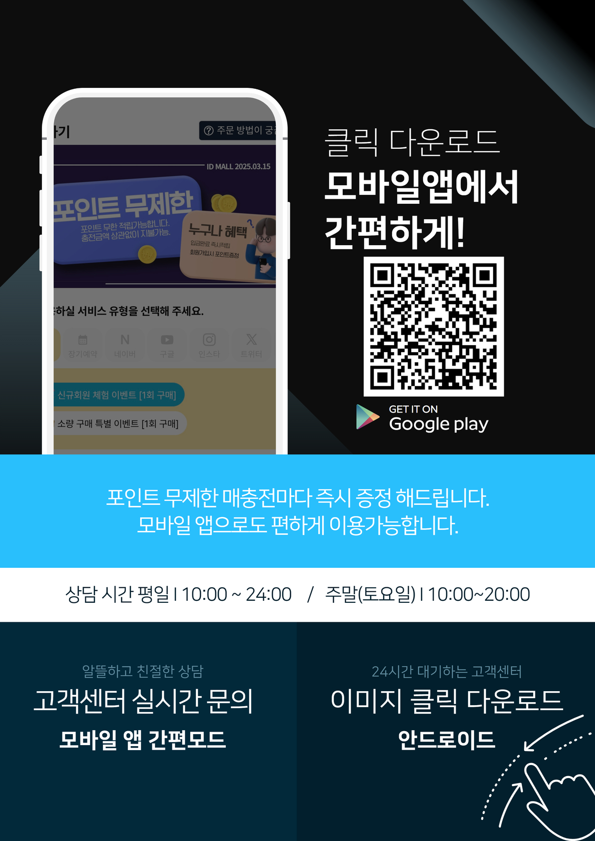 본 서비스는 회사의 업무, 기술상의 장애등 특별한 사유가 없는 한 연중무휴 1일 24시간 서비스를 제공합니다. '아이디몰-ID MALL'이 제공하는 모든 서비스는 24시간 언제든지 이용이 가능하며 회사 시스템에서 자동으로 처리 되어집니다.